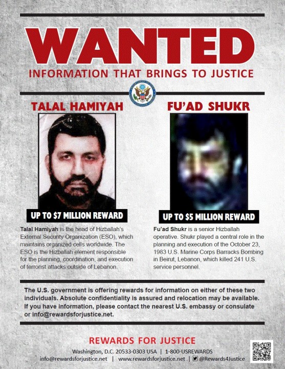 رصدت الولايات المتحدة الثلاثاء مكافآت مالية تصل قيمتها إلى 12 مليون دولار لمن يزوّدها بمعلومات ترشدها إلى طلال حميّة وفؤاد شكر القياديين في حزب_الله اللبناني الذي تعتبره واشنطن منذ 20 عاماً "منظمة إرهابية".