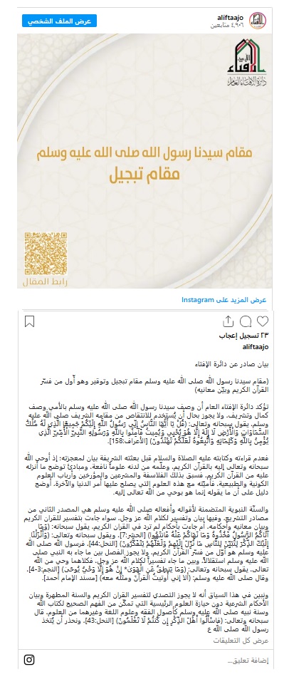 وشددت دار الإفتاء الأدرنية أن وصف رسولنا الكريم " بـ الأمي" لا يجوز بل هو وصف للكمال والتشريف ولا يجوز استخدامه بأي شكل للانتقاص من مقامه الشريف، مشيرًا لى أنه يمثل أحد أوجه الإعجاز الديني إذ تلقى الوحي من الله سبحانه وتعالى دون تعلم مسبق بما يعزز أن القرآن الكريم وحي إلهي خالص وليس نتاجًا بشريًا.