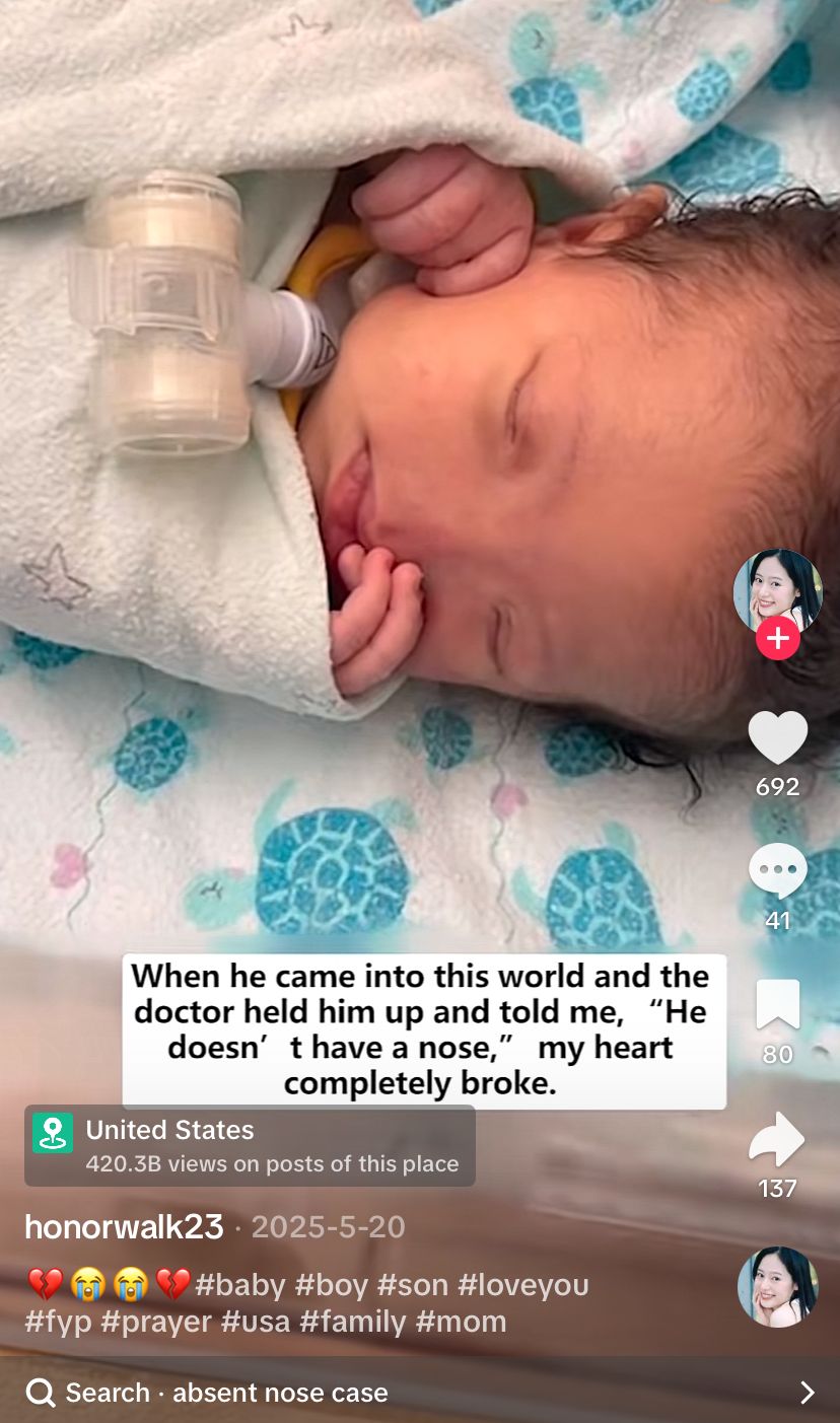 حالة طبّية نادرة في مصر وفي العالم كله ، "طفل بدون انف" ابنة صاحب محتوى مصري مشهور على مواقع التواصل الاجتماعي يستنجد بأطباء متخصصين يدعموه في هذا الموقف الحرج، يُقال ان هذه الحالة النادرة لم تسجل الا 43 مرة فقط في العالم.
